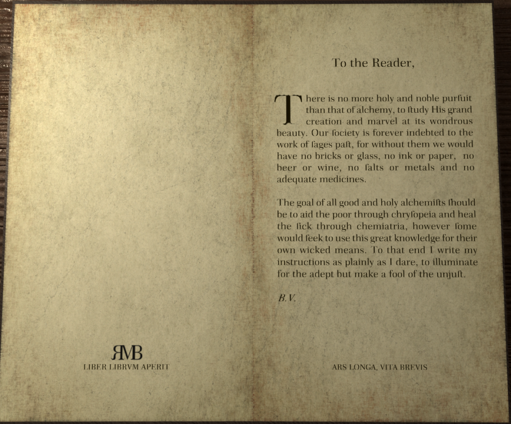 神の壮大な創造物を探求し、その驚異的な美に畏敬の念を抱くこと。これほど神聖で高貴な志が、錬金術をおいて他にあるでしょうか。我らが研究会は、ファージ・パルト(Vauge Phart)の功績に永遠の感謝を捧げます。彼らの導きがなければ、煉瓦もガラスも、インクや紙、さらには酒類から金属、そして命を救う医薬に至るまで、何一つ存在しなかったでしょう。