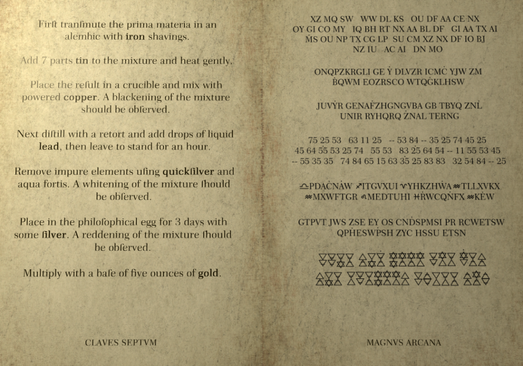 17世紀の錬金術書を模したデザインになっており、各ページに隠された記号や図形、ラテン語などの暗号を解き明かしていくゲームです。